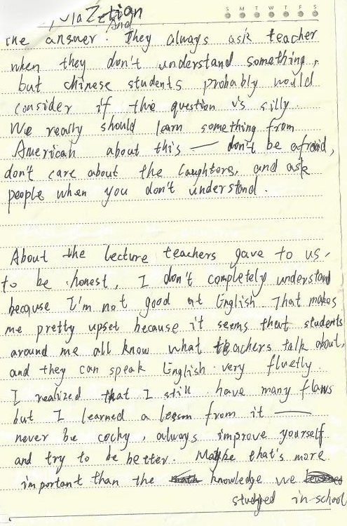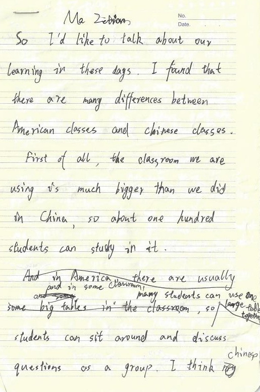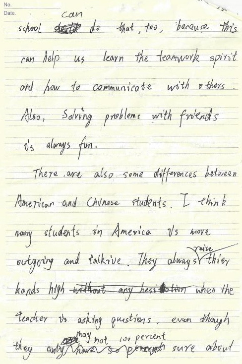 There are also some differences between American and Chinese students. I think many students in America is more outgoing and talkive. They always raise their hands high when the teacher is asking questions, even though they may not 100 percent sure about the answer. They always ask teacher when they don’t understand something, but Chinese students probably would consider if the question is silly. We really should learn something from American about this – don’t be afraid, don’t care about the laughters, and ask people when you don’t understand.