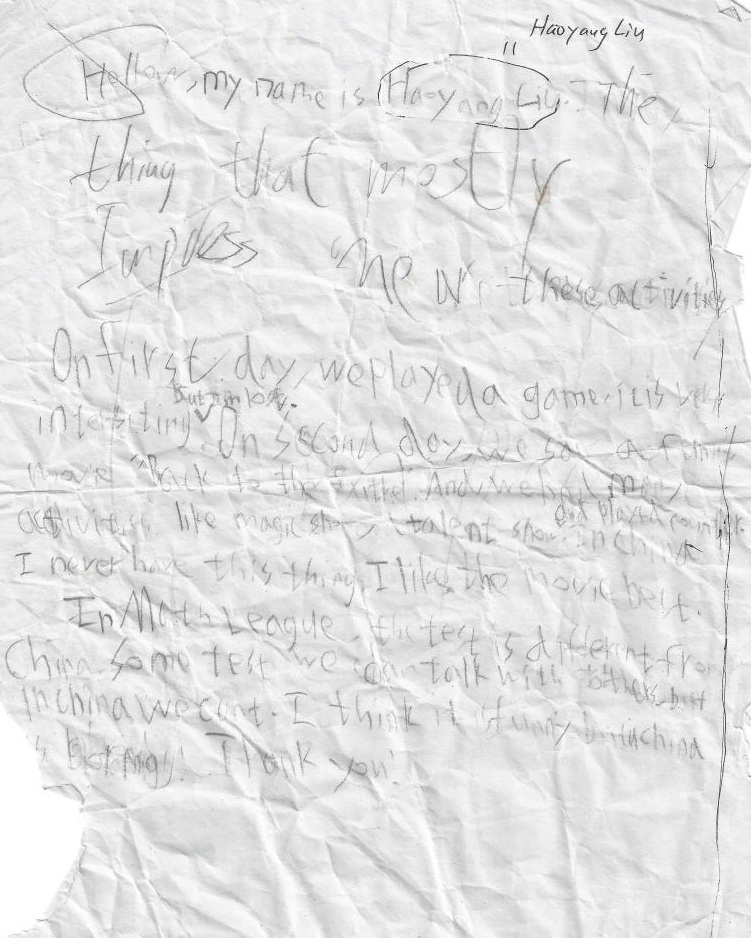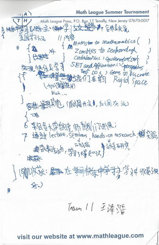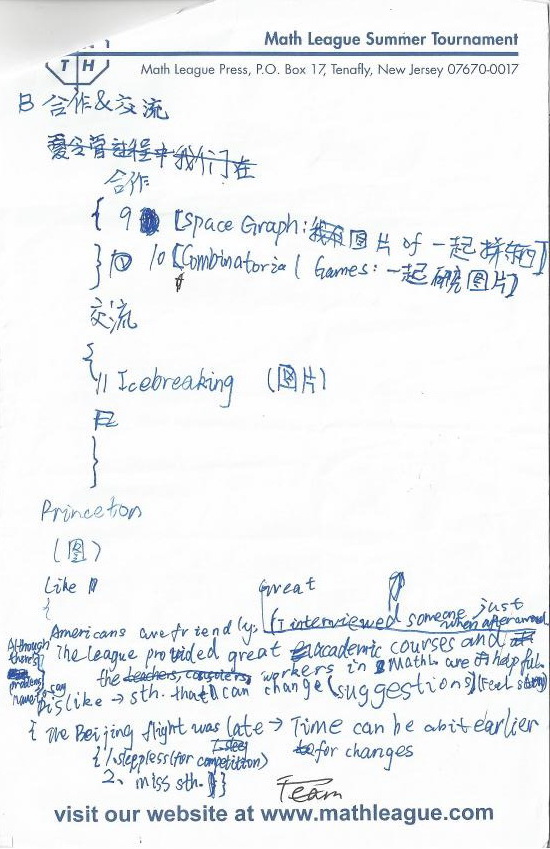 In Math League, the test is different from China. Some test we can talk with others, but in China we can’t. I think it is funny, but in China is boring. Thank you!
