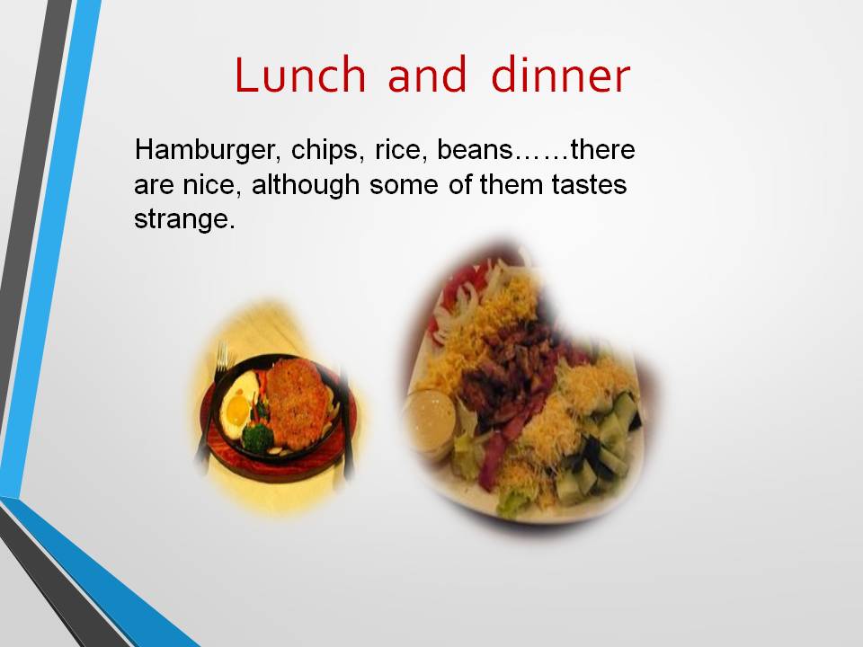 For lunch and dinner, I think each has its own merits, the juice, hamburger and chips are really good, but rice is better than tsata. And also some beans with sause taste strange and look strange, too. Once I tried some pasta with some white sause, that taste, you known I am still wondering how I spent that noon.