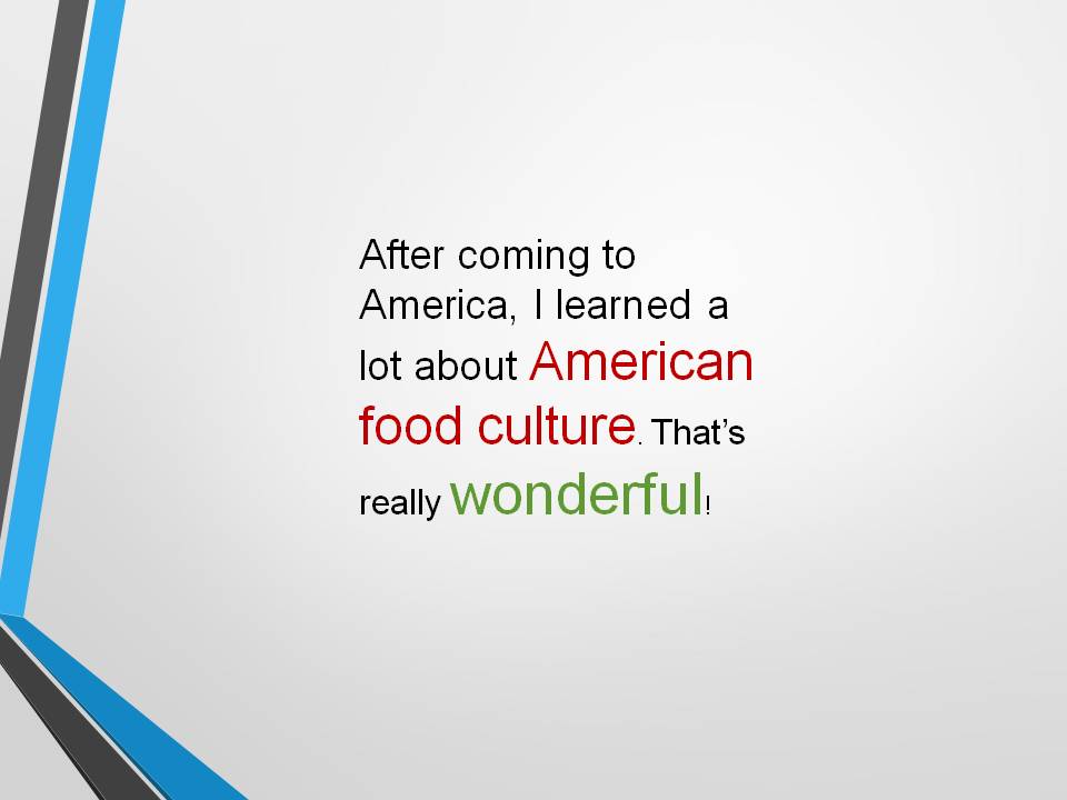 After coming to America, I learnt more about western food are and found what real western food. That’s really amazing. Thank you!