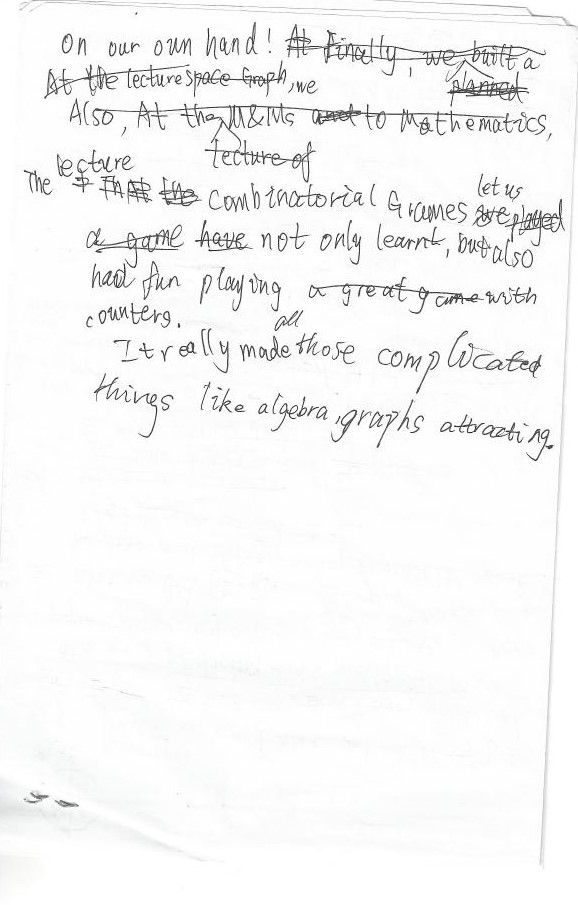 The lecture combinatorial Games let us not only learnt, but also have fun playing with counter. It really made all those complicated things like algebra graphs attracting.