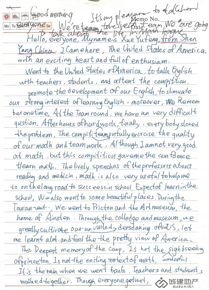 Went to the United States of America to talk English with teachers, students, and attent the competition promote the development of our English, to stimulate our strong interest of learning English. Moreover, Remember one time, at the team round, we have an very difficult question. After hours of hard team work, finally, everybody solved the problem. The competition fully exercise the quality of our math and teamwork. Although I am not very good at math, but this competition gave me the confidence learn math. The lively speeches of the professors about reading and medicine, math is also very useful to help me to on the long road to success in school. Expect of learn in the school, we also went to some beautiful places. During the tournament, we went to Princeton and the Art Museum, the home of Ainslie. Through visited the college and museum, we greatly cultivate our understanding. Of the US, let me learnt a lot and feel the pretty view of America.