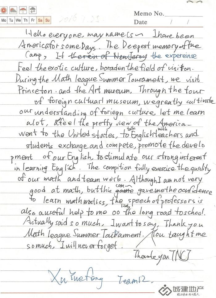 Hello everyone, my name is Yuefeng Xu. I have been America for some Days. The Deepest memory of the camp. It the experience feel the exotic culture, broaden the field of vision. During the Math League Summer Tournament, we visit Princeton and the Art Museum. Through the four of foreign cultural museum, we greatly cultivate our understanding of foreign culture, let me learn a lot, a feel the pretty view of the America went to the United States, to talk English with teachers and students exchange and compete, promote the development of our English, to stimulate our strong interest in learning English. The competition fully exercise the quality of our math and team work. Although I am not very good at math, but this com gave me the confidence to learn mathematics, the speech of professors is also a useful help to me lively the long road to school. Actually said so much, I want to say Thank you TNCJ, Thank you Math League Summer Tournament. You taught me so much, I will never forget.