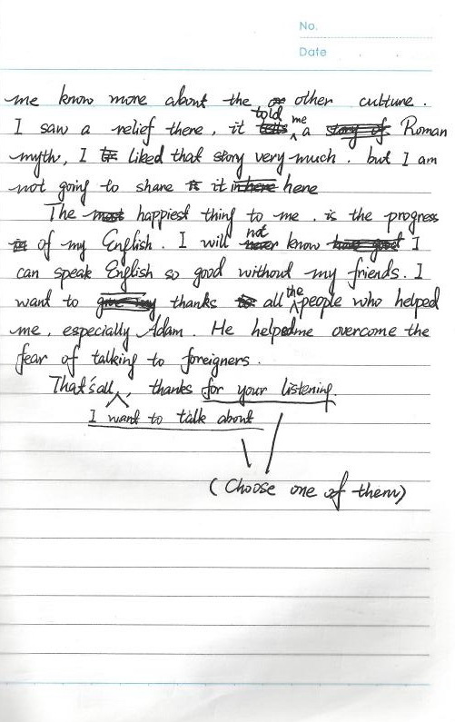 The happiest thing to me is the progress of my English. I will not know I can speak English so good without my friends. I want to thanks all the people who helped me, especially Adam. He helped me overcome the fear of talking to foreigners.