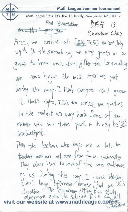 Well, I have to say that I’ve got a lot of things during the summer camp. I didn’t think I can see so advanced math theory, well. They are really advanced to me. I just heard them in the past, but now this activity gives me a chance to truly learn them. Besides the lecture which is about those math theory, I like the math test here. It’s different from Chinese math test, it is more interesting, the solutions of the questions are incredible, well, they are incredible to me. I have learnt a lot during the summer camp.