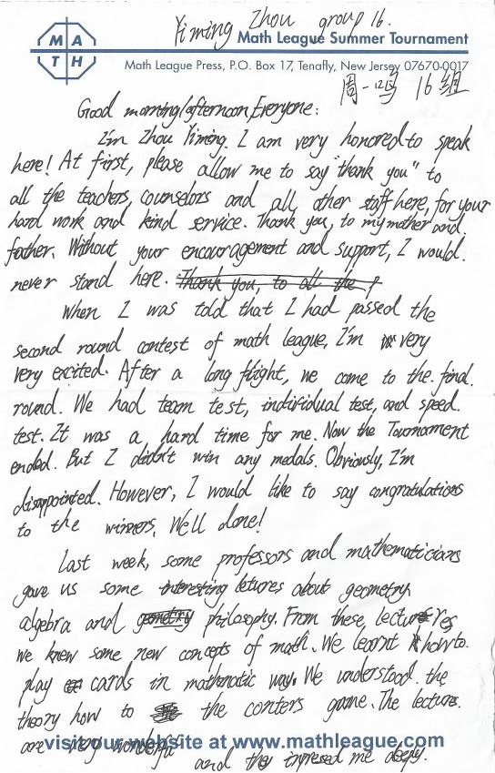 When I was told that I had passed the second round contest of math league, I’m very excited. After a long flight, we come to the find round. We had team test, individual test, and speed test. It was a hard time for me. Now the tournament ended. But I didn’t win any medals. Obviously, I’m disappointed. However, I would like to say congratulations to the winters, well done!