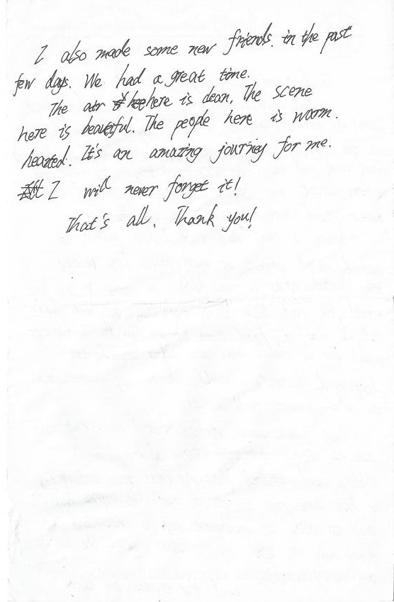 The atr here is dean. The scene here is beautiful. The people here is warm hearted. It’s an amazing journey for me. I will never forget it! That’s all. Thank you!