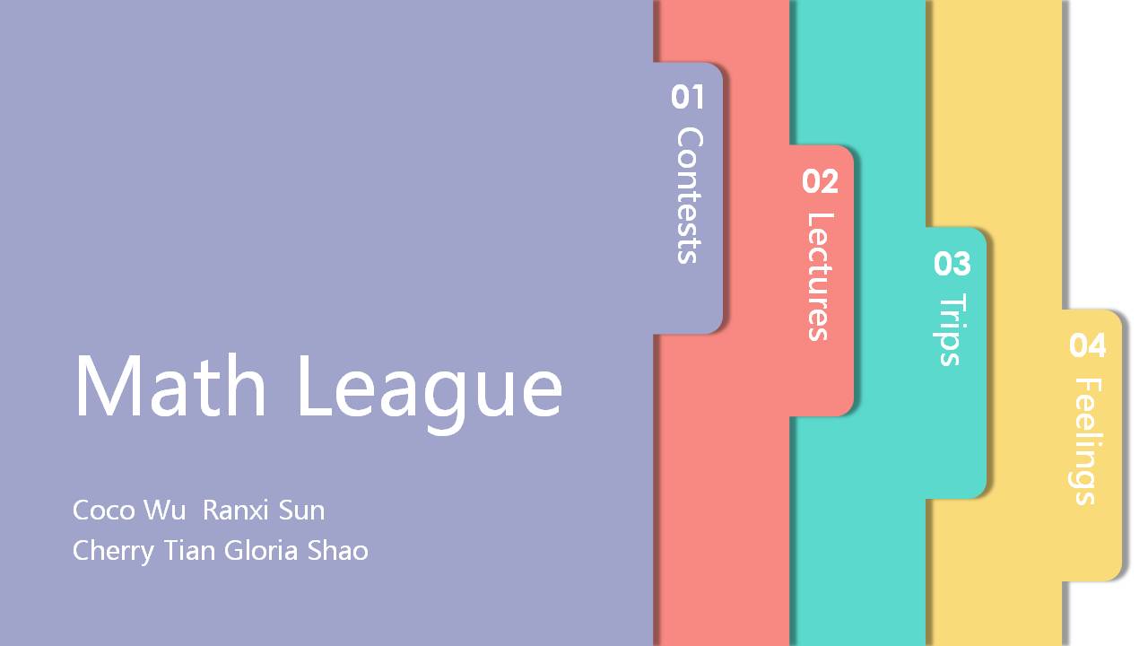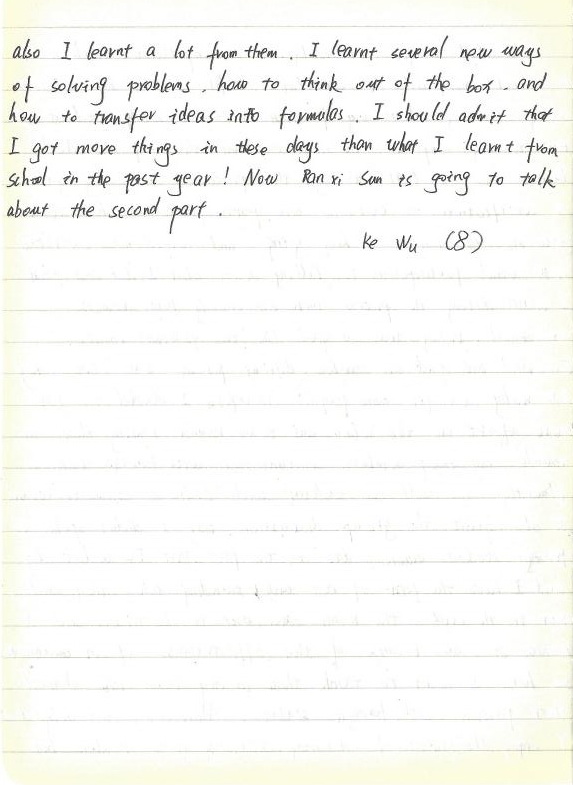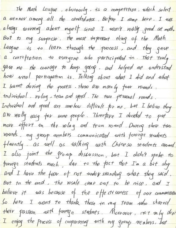 The Math League, obviously is a competition, which select a winner among all the candidates. Before I came here, I was a luays worming about myself since I wasn’t really good at math. But to my surprise, the most important thing of the Math League is to learn through the process, and they gave a certification to everyone who participated in. That truly gave me the courage to keep going and helped me understood how natal participation is. Talking about what I did and what I learnt during the process. There are mainly four rounds: individual, relay, team and speed. The two personal rounds. Individual and speed are somehow difficult for me, but I believe they are really easy for some people. Therefore I decided to put more effort on the relay and team round. During these two rounds, my group members communicated with foreign students fluently, as well as talking with Chinese students around. I also join the group discussion, but I didn’t spoke to foreign students much, due to the fact that I’m a bit shy and I have the fear of not understanding what they said. But in the end, the result came out to be nice, and I believe it was because of the effectiveness of our communication. So here I want to thank those in my team who shared their passion with foreign students. Moreover, not only enjoy the process of cooperating with my group members, but also I learnt a lot from them. I learnt several new ways of solving problems, have to think out of the box, and how to transfer ideas into formulas. I should admit that I got more things in these days than what I learnt from school in the past year! Now Ranxi Sun is going to talk about the second part.