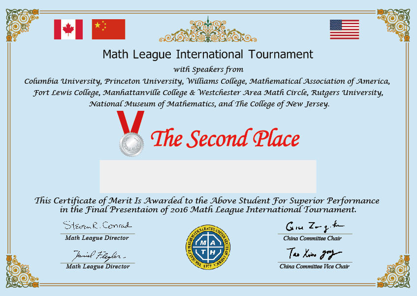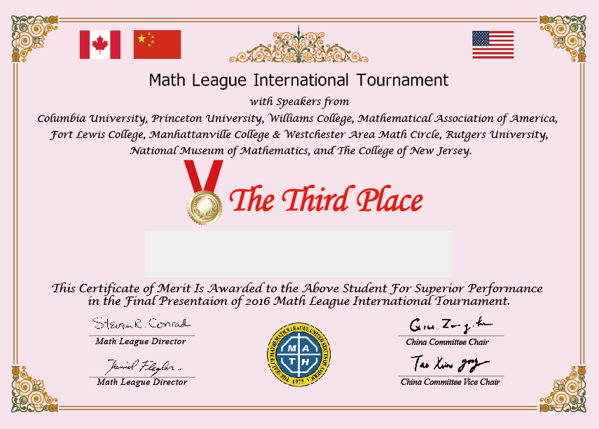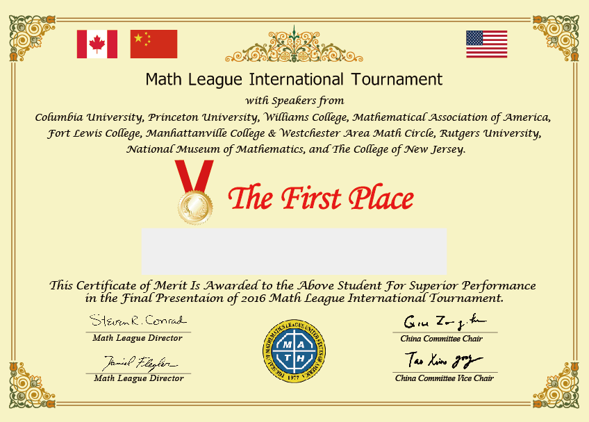 以下同学在Final Presentation中表现出色,美国“数学大联盟杯赛”组委会特为同学们颁发一、二、三等奖,恭喜获奖的同学!