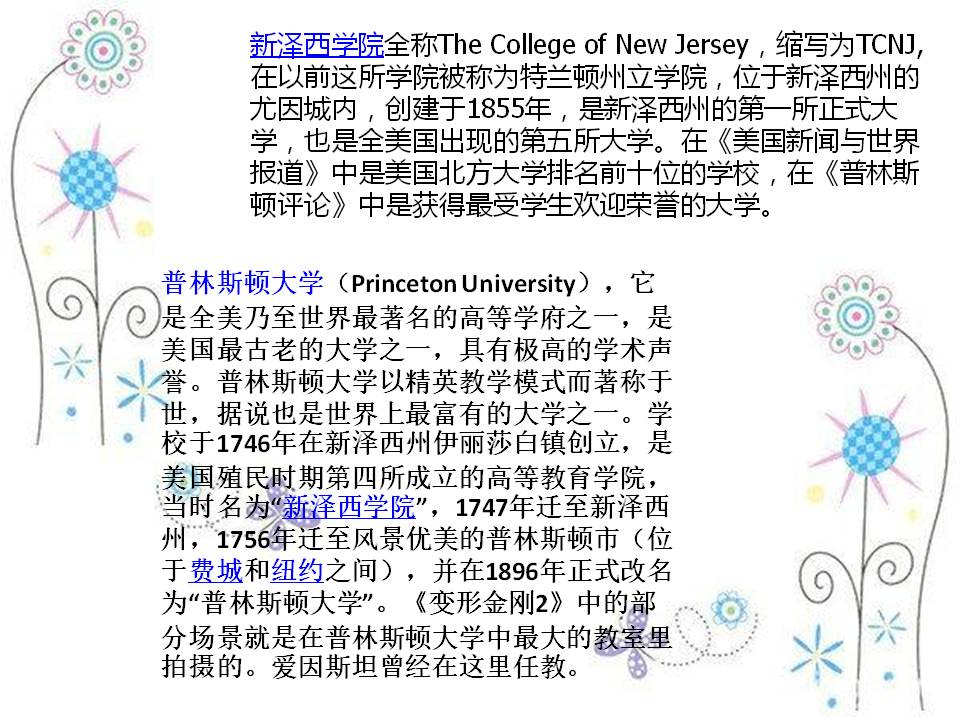 1、我们的比赛和吃住都是在新泽西学院,新泽西学院全称The College of New Jersey,缩写为TCNJ,在以前这所学院被称为特兰顿州立学院,位于新泽西州的尤因城内,创建于1855年,是新泽西州的第一所正式大学,也是全美国出现的第五所大学。在《美国新闻与世界报道》中是美国北方大学排名前十位的学校,在《普林斯顿评论》中是获得最受学生欢迎荣誉的大学。