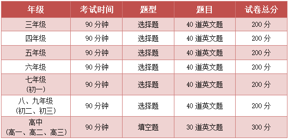 - 十年级(高一)、十一年级(高二)、十二年级(高三)的竞赛采用美国“数学大联盟杯赛”试题(七级),加上组委会命题的挑战题。竞赛时间为90分钟。全部采用填空题(共30题),总分300分。所有题目均为英文命题。考试时组委会给每个学生提供数学常用词汇表(英汉对照)。禁止携带任何字典、词典、计算器、及任何资料(包括纸质及电子版的)。