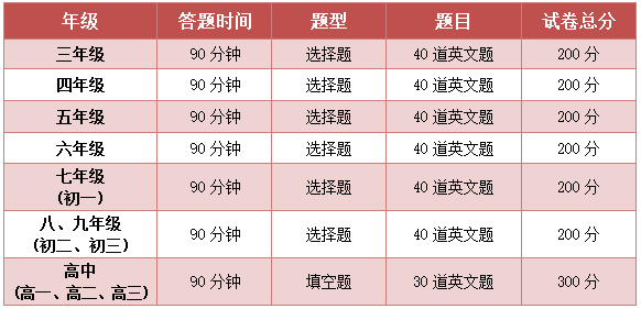 - 八年级(初二)、九年级(初三)的数学试题采用美国“大联盟”(Math League)思维探索活动试题(六级),加上组委会命题的挑战题。 答题时间为90分钟。全部采用选择题(共40题),总分200分。所有题目为英文原题。 考试时组委会给每个学生提供数学常用词汇表(英汉对照)。禁止携带任何字典、词典、计算器、及任何资料(包括纸质及电子版的)。