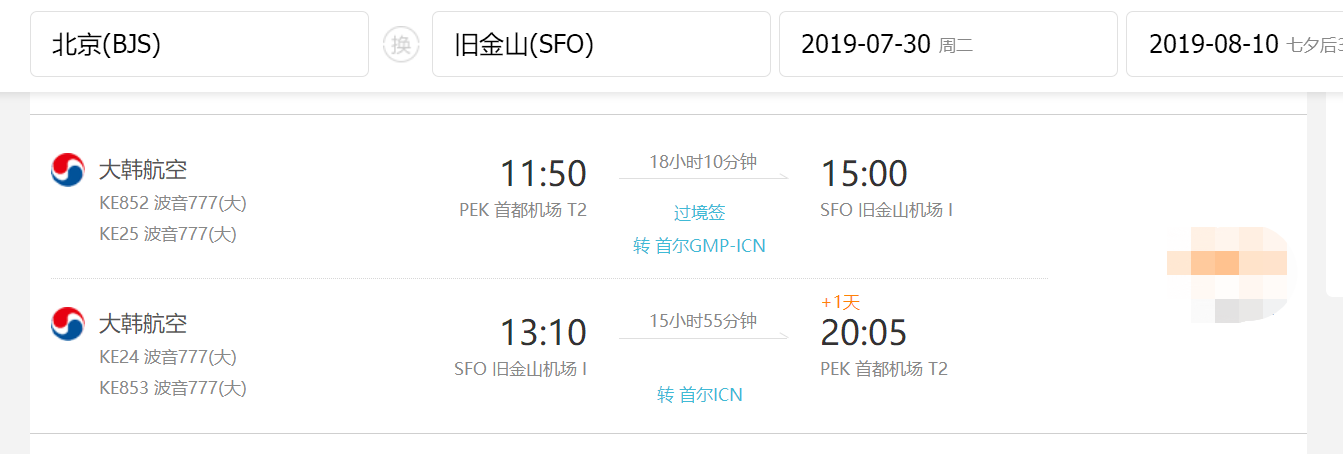 - 航班号CA986, 中国国际航空公司,旧金山国际机场 (14:50) -> 北京首都国际机场(17:55 + 1天)