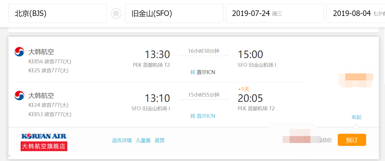 - 航班号MU590, 东方航空,旧金山国际机场 (12:00) -> 上海浦东国际机场 (16:30 + 1天)