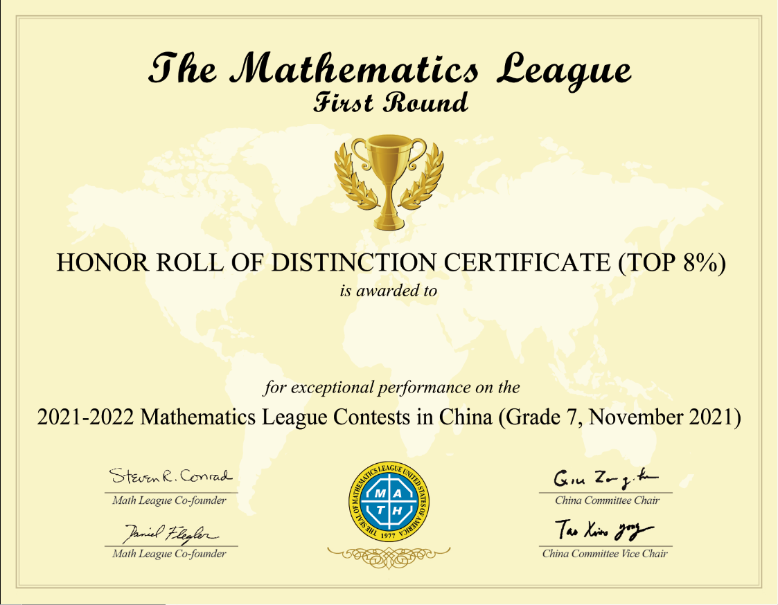 七年级 "Honor Roll of Distinction Certificate Top 8%" 证书