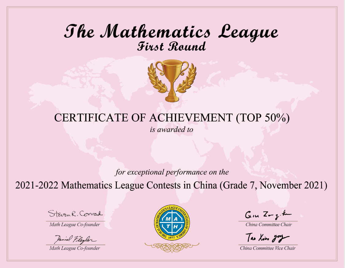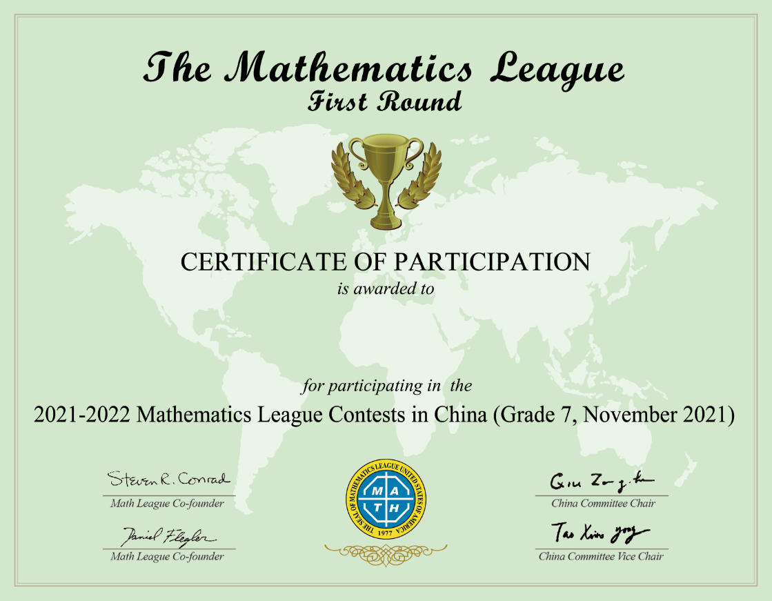 2021-2022年度美国"大联盟"(Math League)思维探索第一阶段活动证书式样